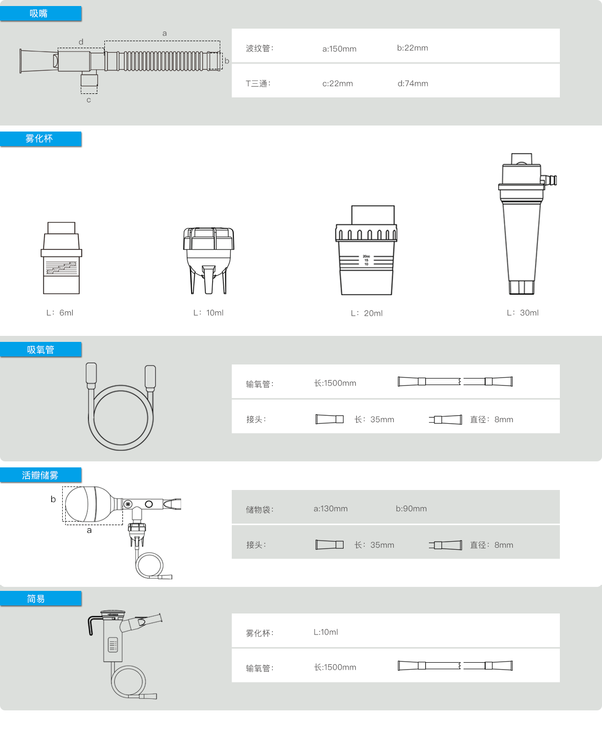 2. The product is composed of oxygen tubing, a nebulizing cup, a nebulizing nozzle, corrugated tubes, an air filter and T-shaped tee. packaged individually.